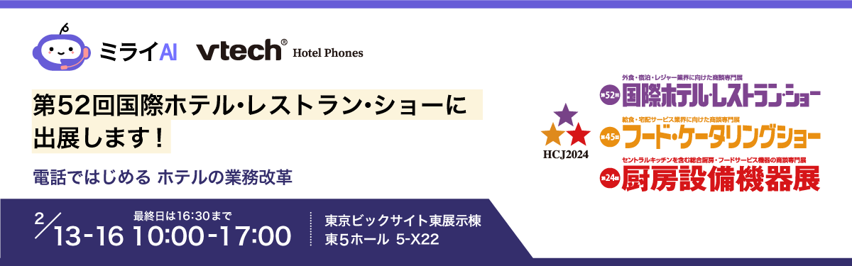 このような人手不足や、チェックイン・アウトなど繫忙時間帯での電話応対にお悩みの宿泊業事業者様に最適なサービスとして、電話の一次対応をAIが代行するミライAIがございます。