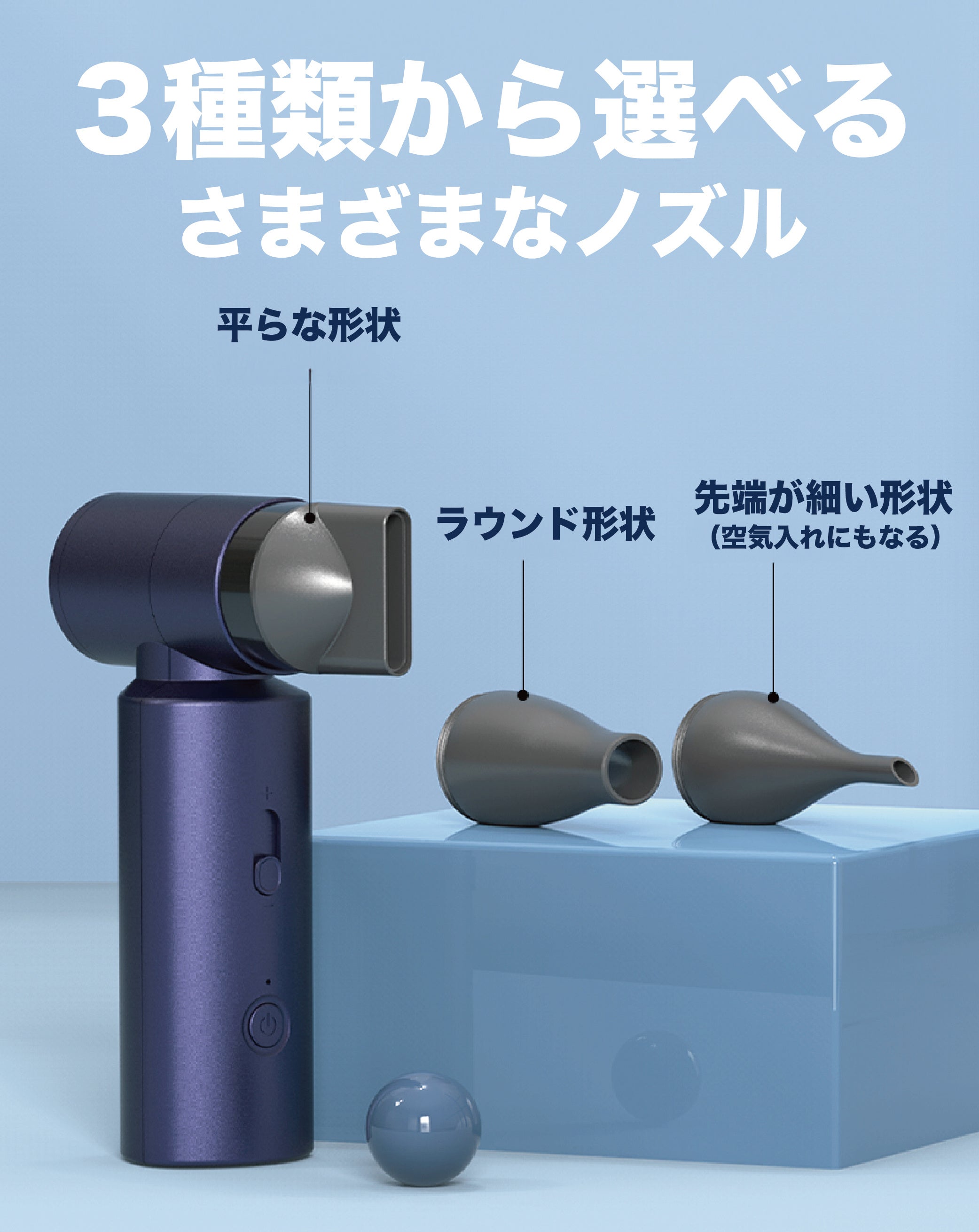 ZephGaleは多様な用途に応じて3種類のノズルを付け替えられます。