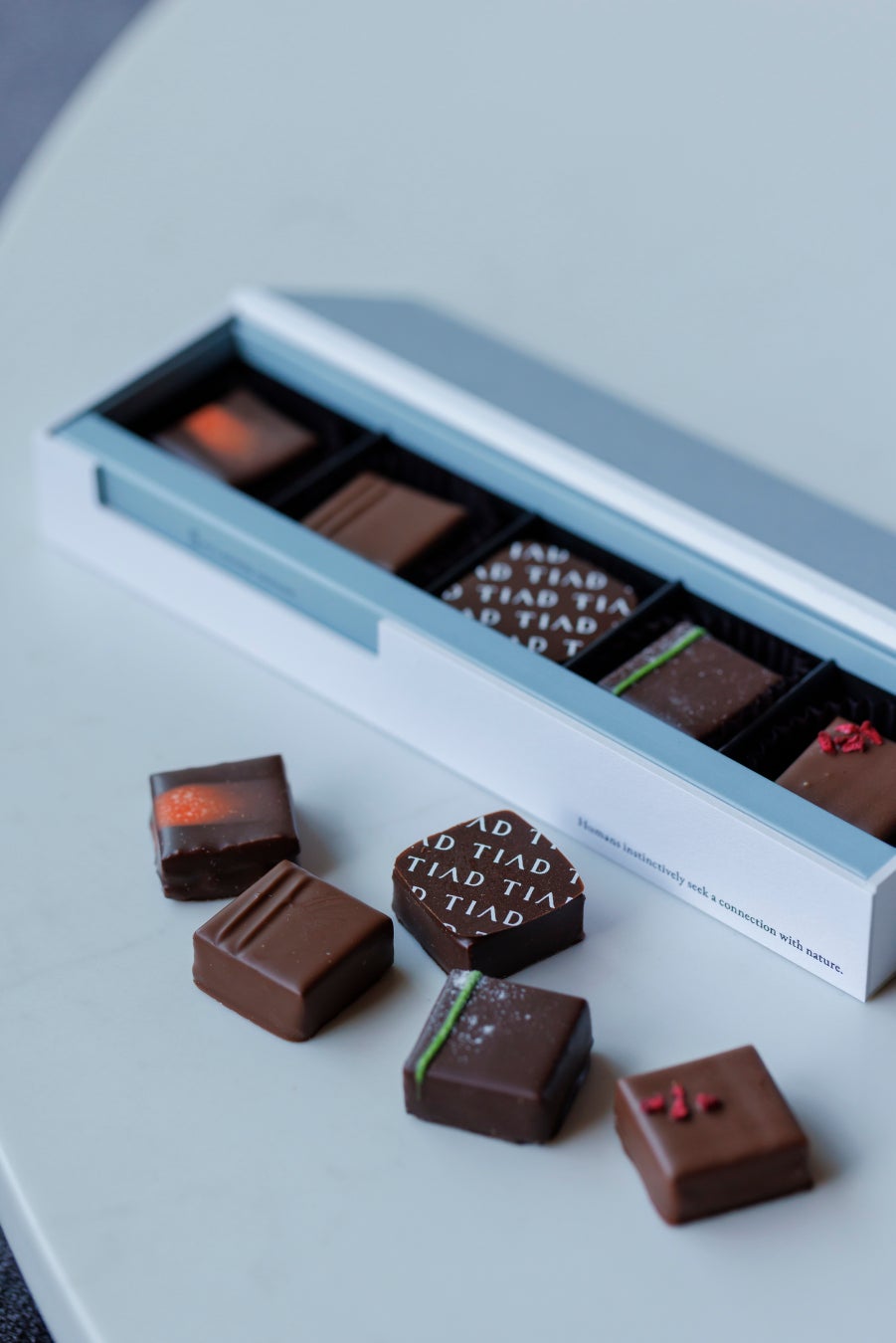 バレンタインにふさわしい特別セレクションは、オレンジの食感も楽しい「オレンジピール&パッションガナッシュ」、天然バニラビーンズが香る「天然バニラ&ミルクガナッシュ」、大人気の「ビターガナッシュ」、宇治抹茶ラテをイメージした「抹茶&ミルク」、甘酸っぱい味わいが癖になる「苺&ミルク」の5つのフレーバーを集めました。(上記画像、左から順)