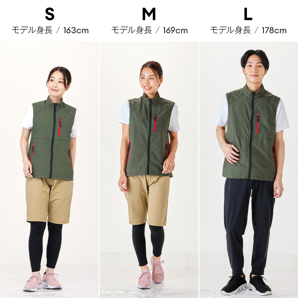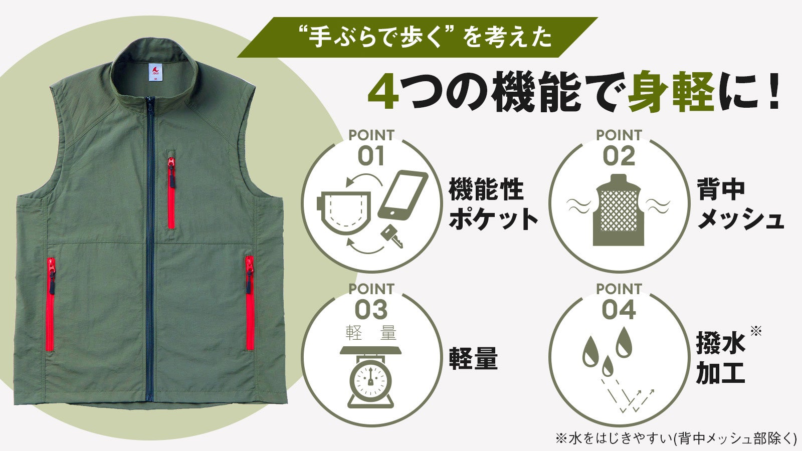 リュックサックの上げ下ろしをしなくても必要なものを取り出しやすいポケット付き!軽量×通気性×撥水加工が揃った機能ベストです。