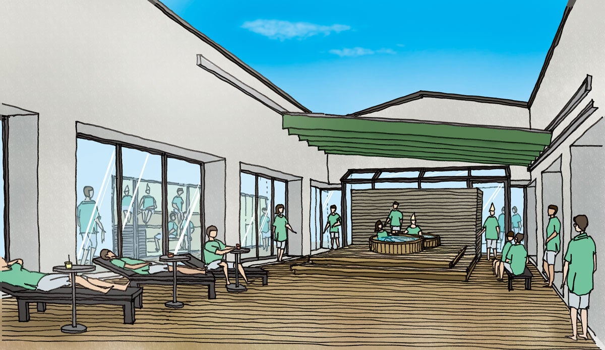 本館別棟の有料サウナエリア。北欧のサウナの楽しみ方から着想を得た3種類のサウナを提供します。中庭デッキでは、外気浴や井戸水を使った水風呂も。屋内のラウンジエリアでは、内気浴やフリードリンク、書籍などをゆったりとお楽しみいただけます。※中学生以上の方がご利用いただけます