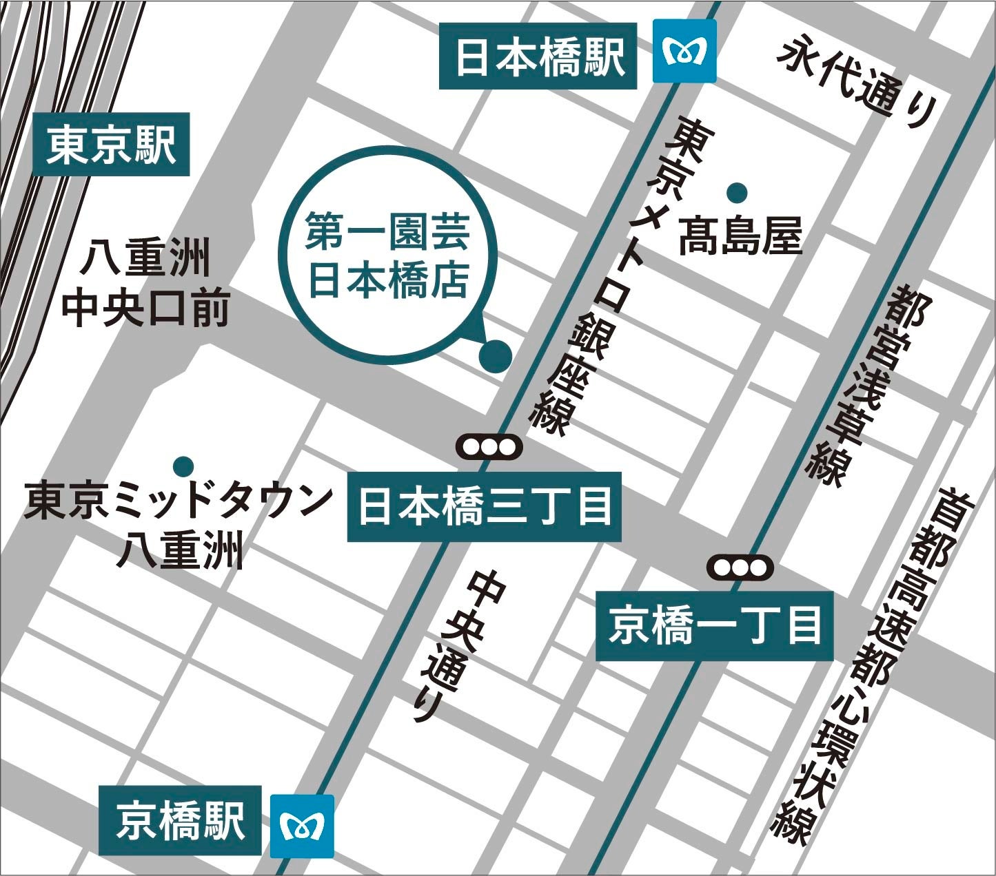 そして江戸時代以来、日本橋をまたいで南北を貫く、歴史と文化が行き交う日本橋中央通りに、明治から、大正・昭和・平成・令和へと5つの時代をまたいできた第一園芸のフラッグシップとなる日本橋店がオープンします。