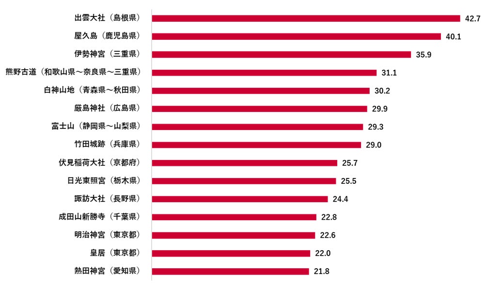 行きたいパワースポットを聴取したところ、1位「出雲大社」42.7%、2位「屋久島」40.1%、3位「伊勢神宮」35.9%となった。2023年に大ヒットしたTVドラマ『VIVANT』の聖地として話題の「出雲大社」は、10代~50代でトップとなり、注目の高さがうかがえる。