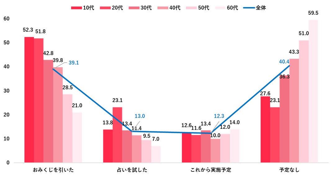 今年の運勢占いまたはおみくじの利用について、全体で「予定なし」と回答した人が約4割となり、約6割の人にいずれかの利用意向があることが分かった。特に10代と20代では、約7割にいずれかの利用意向があり、全体よりも高かった。