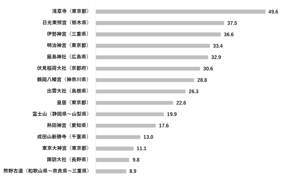 次に、行ったことがあるパワースポットを聴取したところ、1位「浅草寺」49.6%、2位「日光東照宮」37.5%、3位「伊勢神宮」36.6%だった。