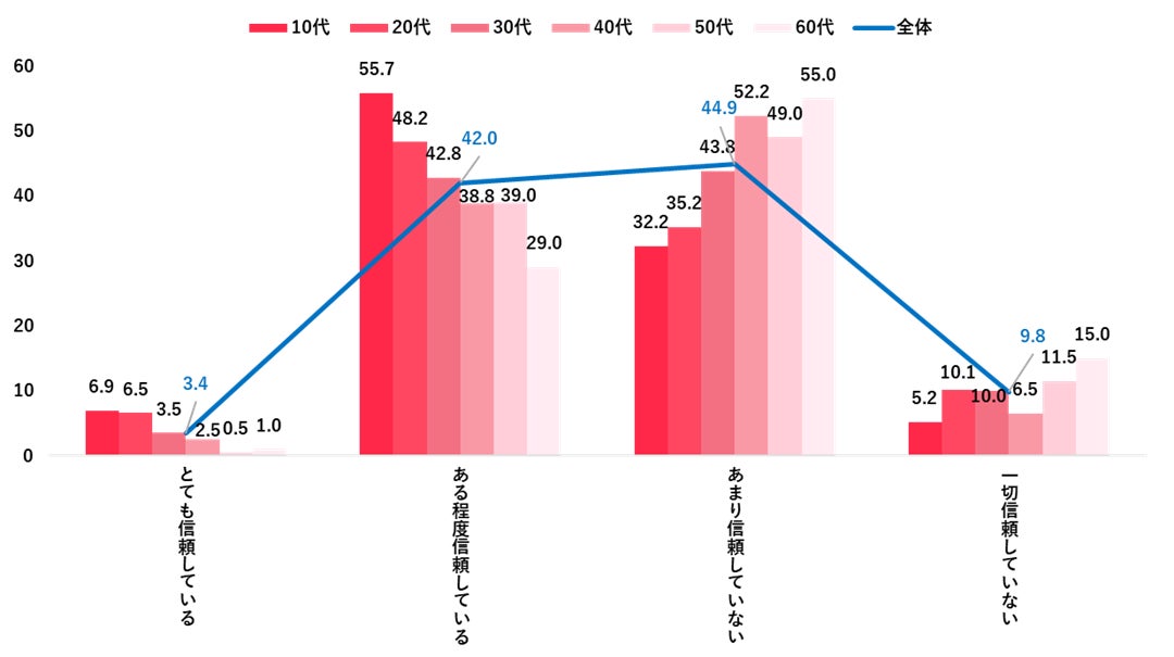 年代が低いほど占いやおみくじへの信頼度が高い傾向にあり、10代の55.7%が「ある程度信頼している」と回答した。一方、60代では「あまり信頼していない」が55.0%で、10代と逆転する結果となった。