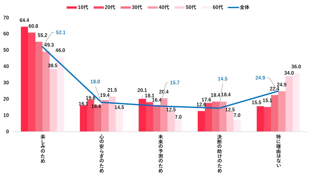 占いやおみくじを利用する理由は、「楽しみのため」が全体で52.1%だった。年代別では10代が64.4%と最も高かった。どの年代でも約4割以上が「楽しみのため」と回答して最多となっており、年代に関わらず、占いの人気が確認された。