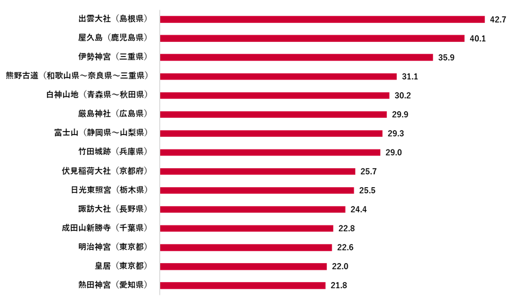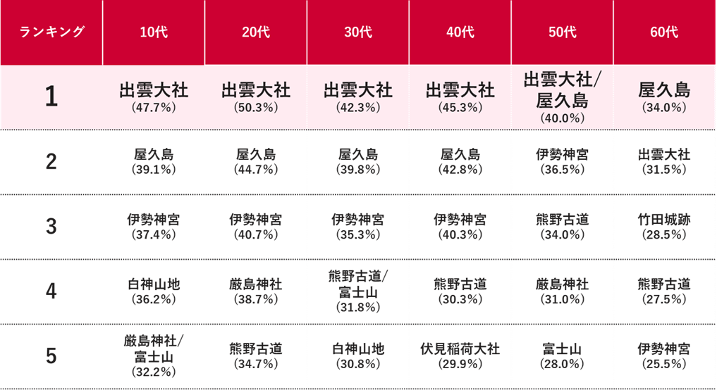 行きたいパワースポットを聴取したところ、1位「出雲大社」42.7%、2位「屋久島」40.1%、3位「伊勢神宮」35.9%となった。2023年に大ヒットしたTVドラマ『VIVANT』の聖地として話題の「出雲大社」は、10代~50代でトップとなり、注目の高さがうかがえる。