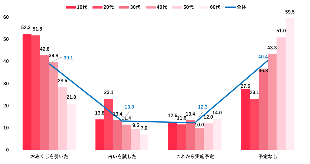 今年の運勢占いまたはおみくじの利用について、全体で「予定なし」と回答した人が約4割となり、約6割の人にいずれかの利用意向があることが分かった。特に10代と20代では、約7割にいずれかの利用意向があり、全体よりも高かった。