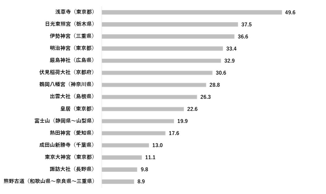 次に、行ったことがあるパワースポットを聴取したところ、1位「浅草寺」49.6%、2位「日光東照宮」37.5%、3位「伊勢神宮」36.6%だった。