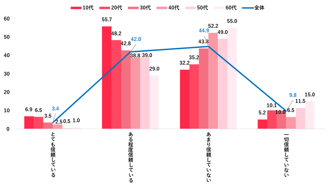 年代が低いほど占いやおみくじへの信頼度が高い傾向にあり、10代の55.7%が「ある程度信頼している」と回答した。一方、60代では「あまり信頼していない」が55.0%で、10代と逆転する結果となった。