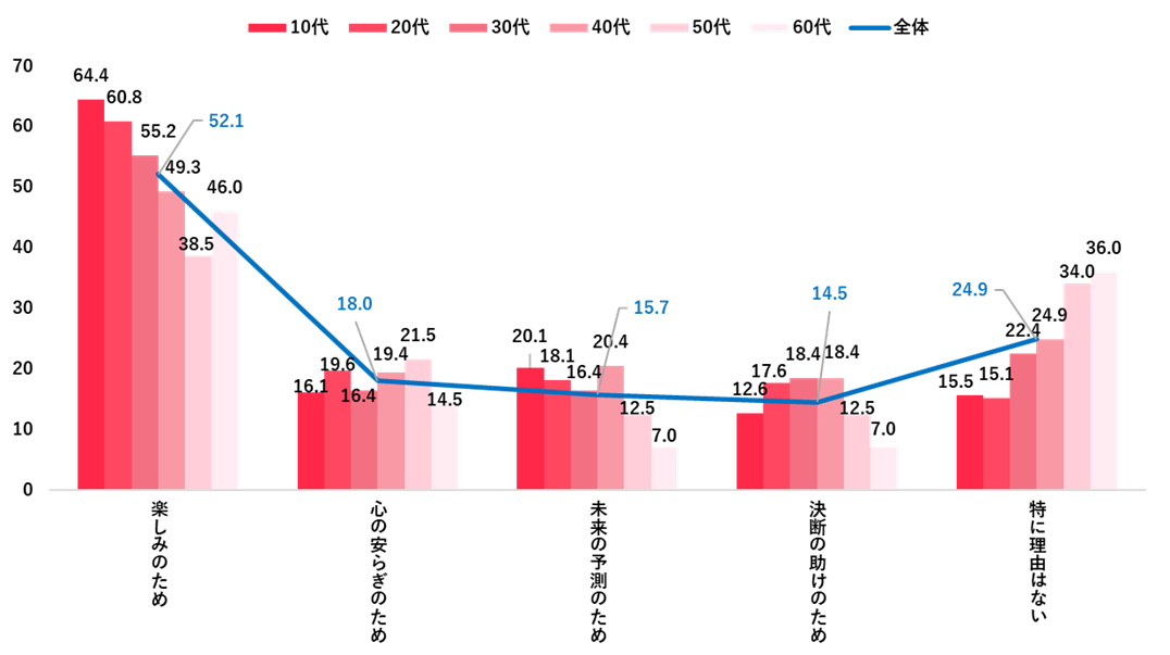 占いやおみくじを利用する理由は、「楽しみのため」が全体で52.1%だった。年代別では10代が64.4%と最も高かった。どの年代でも約4割以上が「楽しみのため」と回答して最多となっており、年代に関わらず、占いの人気が確認された。