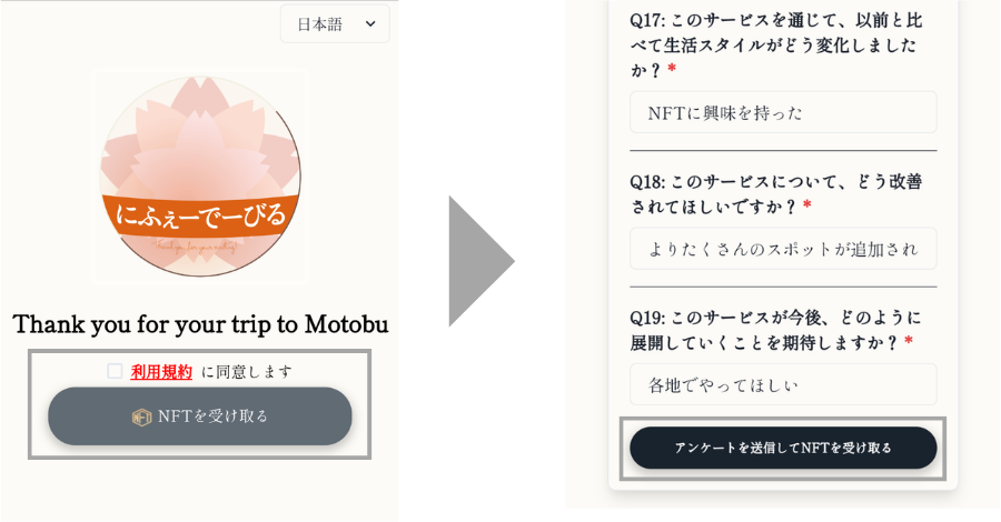 貸し切りタクシーでの観光が終わった後に、利用者はアンケートに回答することで、アンケート回答者限定NFTが受け取れます。