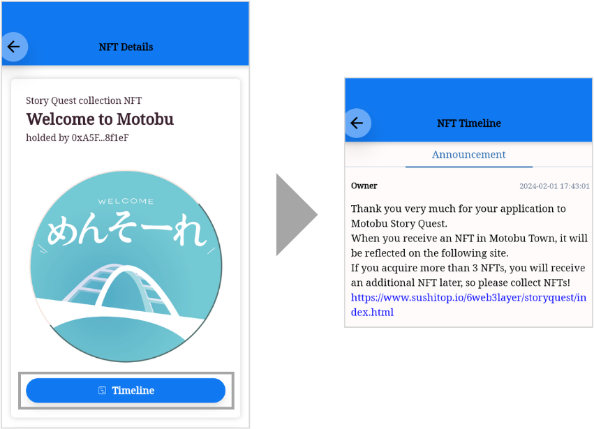 また、事前登録者向けNFTは、当社が提供する本事業用オリジナルNFTビューワー「SUSHI TOPマイアプリ」上で閲覧することができます。NFTビューワーには、NFTごとにタイムライン機能が備わっており、運営からのメッセージを閲覧することも可能です。