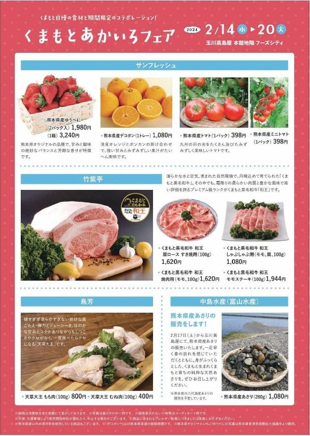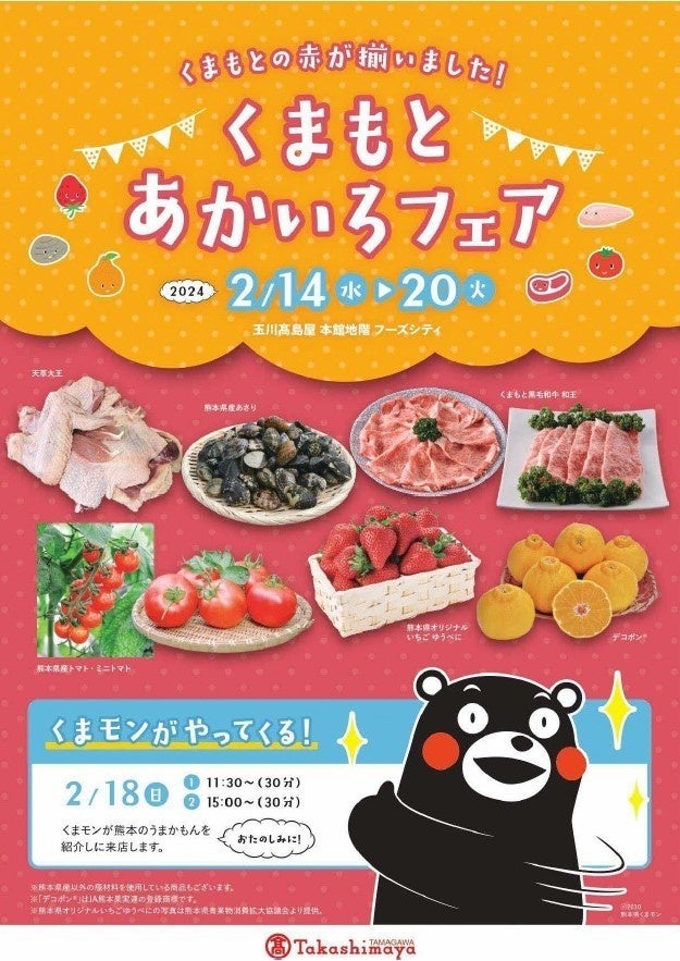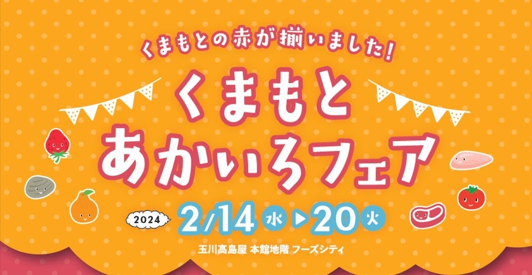熊本県(知事:蒲島 郁夫)は、「くまもとの赤」などの魅力ある食材を首都圏の皆様に知っていただくため、玉川高島屋において、熊本県の特産品、名産品などを販売する「くまもとあかいろフェア」を2024年2月14日(水)から2月20 日(火)まで開催します。