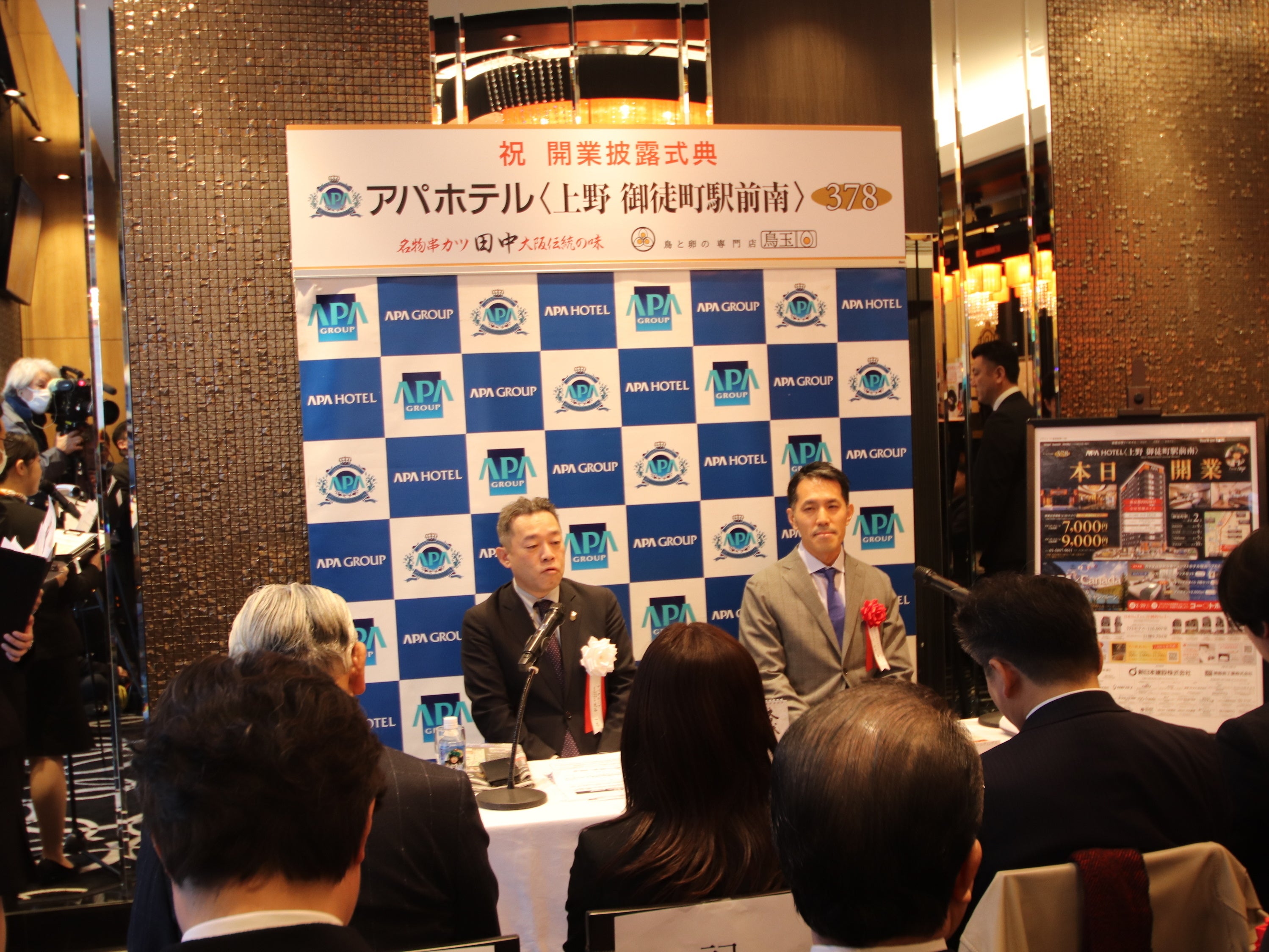 記者発表では、アパグループ社長 兼 最高経営責任者(CEO)元谷 一志は「2023年の累計訪日外客数は2,500万人を突破し、今後まだまだ増加していくことが予想される。日本の人口が減少傾向にあることを鑑みると、今後は訪日外国人のお客様に則した客室づくりも考えていく必要があり、当ホテルにおいては、大柄な方でもゆったりと着座できるように客室のデスク・チェアーの高さを5cm高くし、また明るい照明が苦手という方でも自分好みの明るさでご滞在できるように主照明に調光機能を追加するなど新たに4つのイノベーションポイントを設けた。小さなイノベーションではあるが、多くのお客様が今まで以上に快適にお過ごしいただきたいという思いからの進化であり、今後も『進化するアパホテル』として利用者目線と経営者目線の両面で考え、より快適な空間を提供し続けていきたい。当社は2027年3月末までにアパホテルネットワークとして15万室展開の目標を立てており、現在11万6千室を越え順調に推移している。目標達成に向けて今後も規模を拡大しながら、お客様に支持されるホテルを目指していきたい。」と述べた。