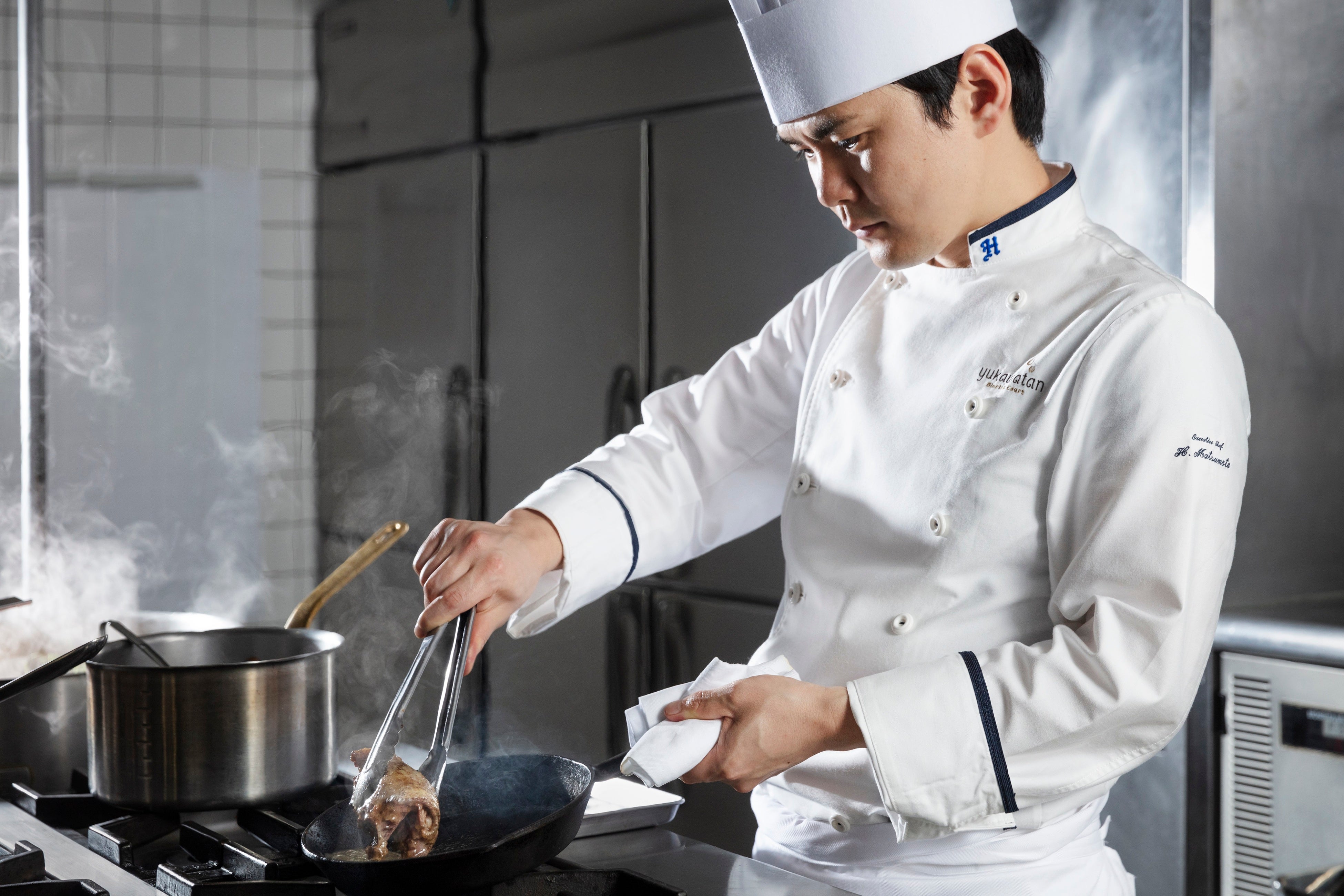松本博史。長野県出身。東京のレストランでスーシェフとして経験を積み、2015年に星野リゾート 軽井沢ホテルブレストンコートへ。2017年、ブレストンコート ユカワタン料理長に就任。古典的な調理技法を大切にしながら、それを現代の形にしていくことでフランス料理の魅力を伝えていきたいと語る松本シェフ。時を経ても色褪せないタイムレスな料理が信条です。