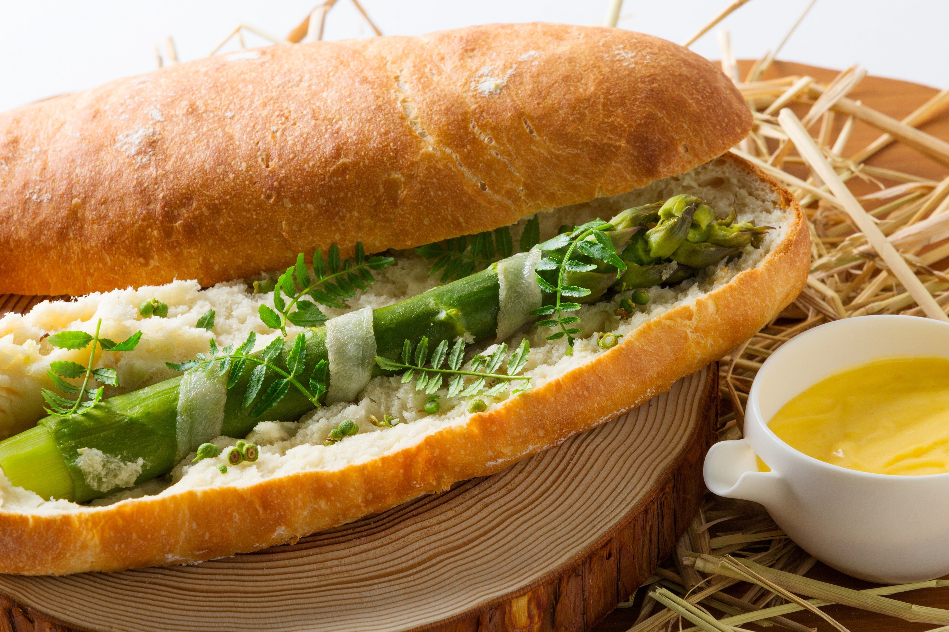 旬のアスパラガスが持つ旨味と水分を最大限に引き立たせるため、アスパラガスをパンで包み、蒸し焼きにしたメニューです。焼き上がったパンを開いて、蒸されて熱々になったアスパラガスを楽しみます。アスパラガスには、ソースオランデーズ(*2)をあわせました。まろやかで酸味のあるソースが、アスパラガスの旨味をいっそう味わい深いものにしています。