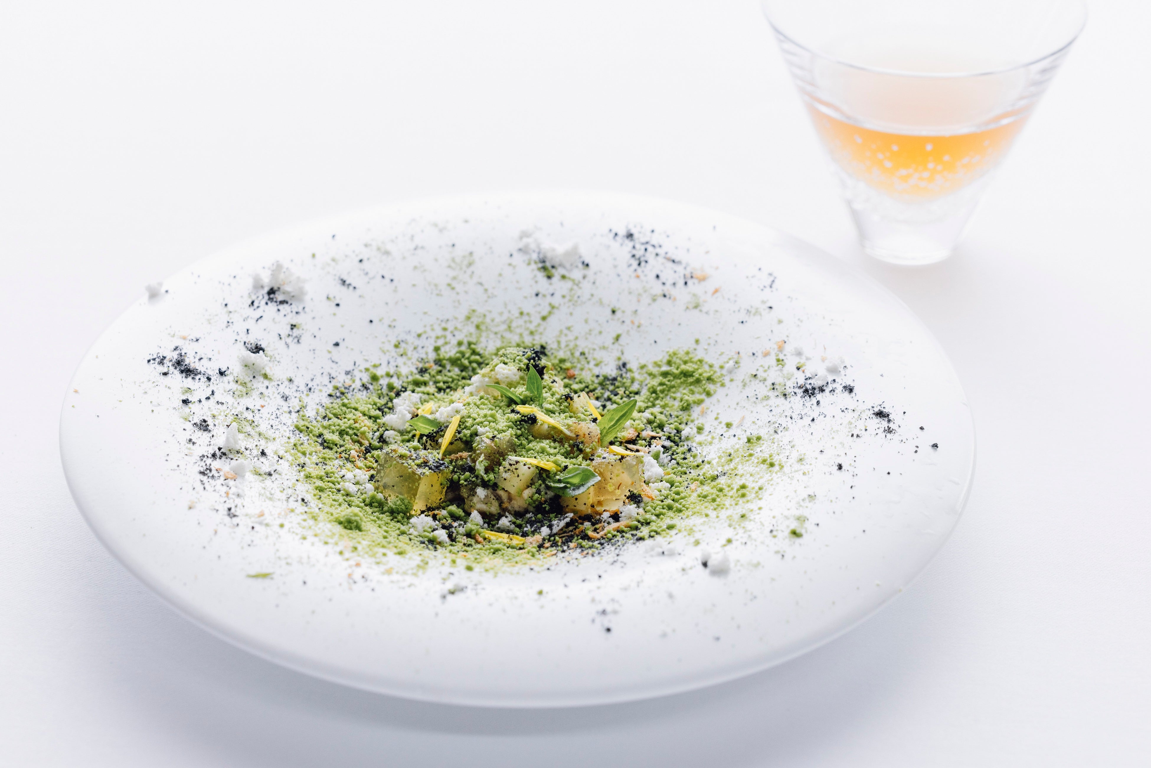 信州で古くから食されている鯉。ユカワタンではおもてなしの気持ちをこめて、年間通して鯉を提供しています。「鯉と蕗の薹のコビネゾン」は、鯉を春の山菜の代表格ふきのとうとともに味わう前菜です。ふきのとうは、味噌の香りをうつしアイスパウダー状にしました。味噌がふきのとうのほろ苦さをやわらげ、味わいをマイルドにしています。ソースには、ソースヴァンブラン(*1)を。鯉、ふきのとう、味噌、といった日本料理をイメージする組み合わせに、あえてフランス料理の伝統的なソースを合わせることで、ユカワタンならではのフランス料理に仕立てています。