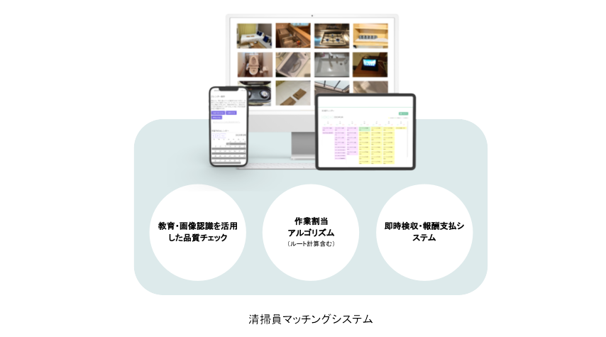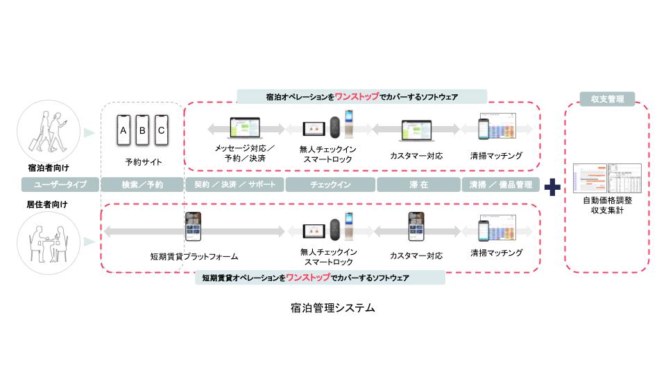 このような状況下、両社は、本提携に基づき、matsuri technologiesが開発した不動産DXシステムを活用することで、宿泊産業が抱える宿泊先の確保や労働生産性の向上といった課題解決に取り組みます。今回活用するmatsuri technologiesの不動産DXシステムは、宿泊施設における業務効率の向上や省人化を実現するもので、民泊、短期賃貸などを対象とした宿泊管理システムによる完全非対面・遠隔での施設運営、さらには、ギグワーカー*2を対象としたマッチングシステムに よる清掃員の確保などを可能とします。