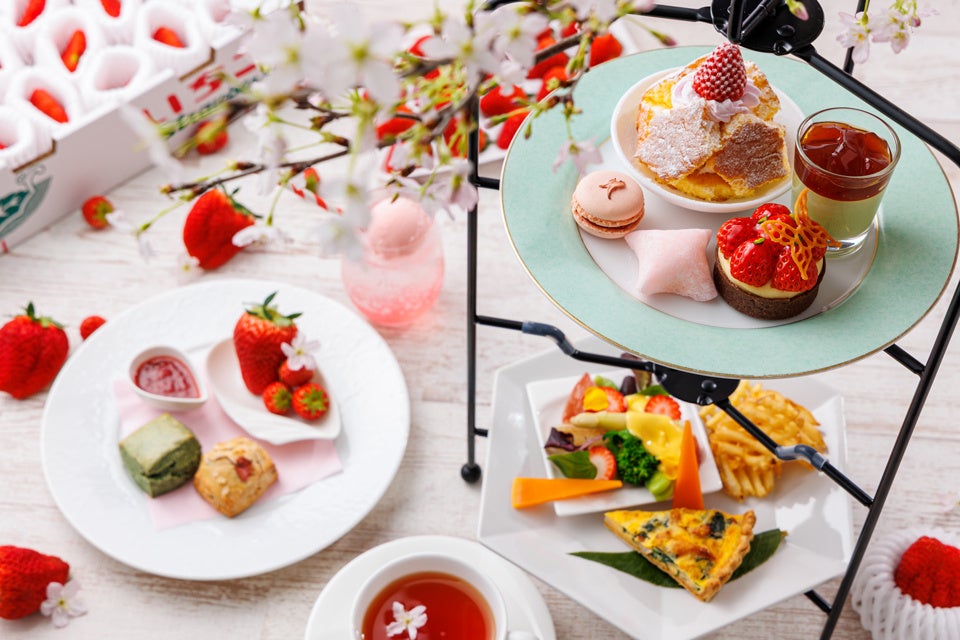 スイーツには満開の桜の木をイメージし、桜のクリームにふわふわのスポンジ生地をはりつけた“苺のショートケーキ”や桜薫るショコラに苺がたっぷりのった“タルト”、抹茶のパンナコッタと桜の紅茶ジュレの2層のハーモニーが楽しめる“ヴェリーヌ”などをご用意。また一口では食べきれない特大サイズの“紅ほっぺプレミアム苺”もお楽しみいただけます。