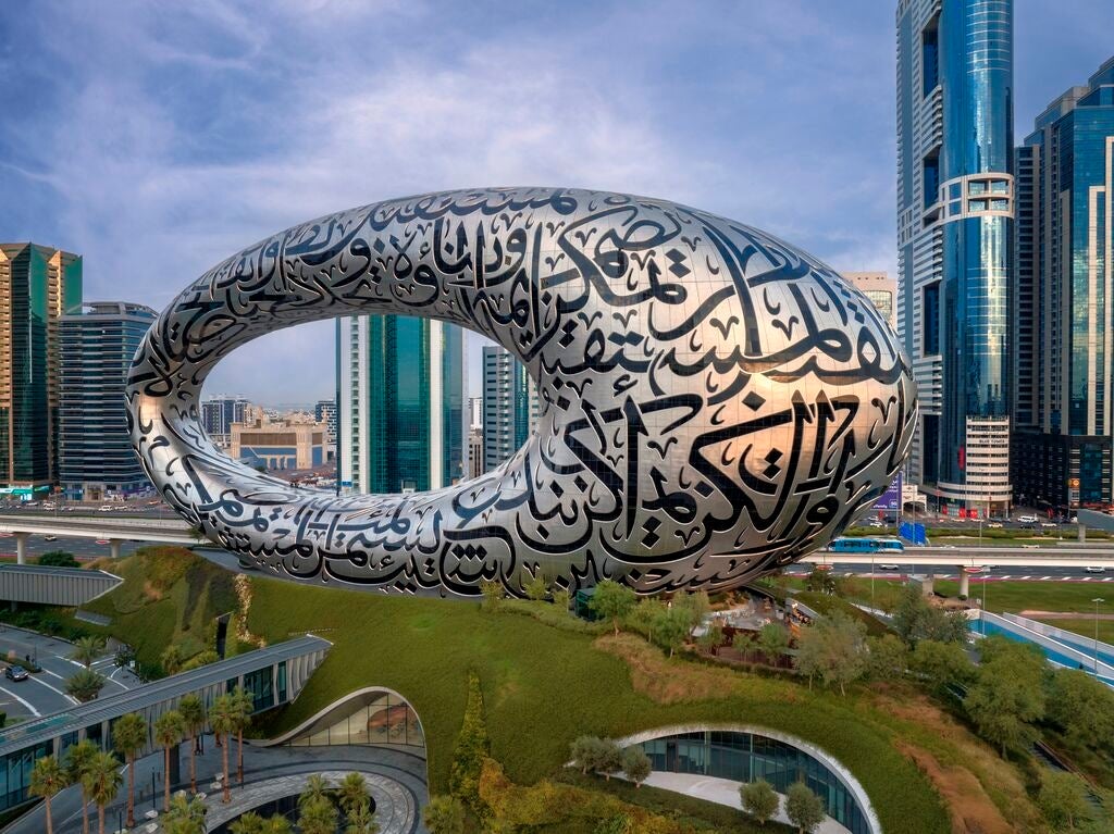 宇宙船を連想させる楕円形にデザインされた、ドバイ市内の中でも一際目を引く建築物です。全7フロアからなる内部は、柱を使わない画期的な建築法が採用されていて、一見の価値ありです。https://www.visitdubai.com/ja/divs/museum-of-the-future-design
