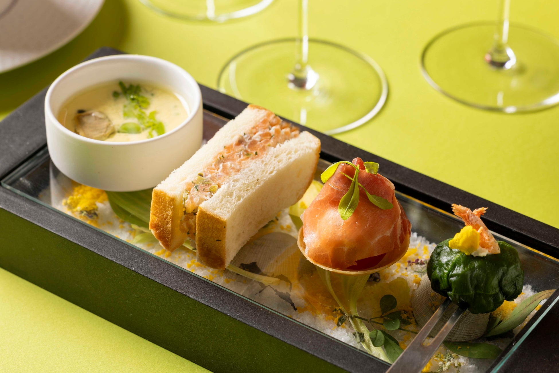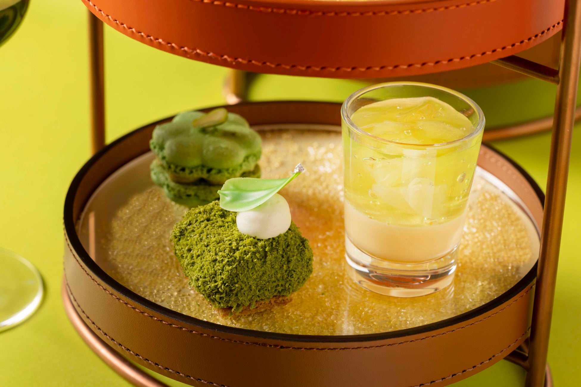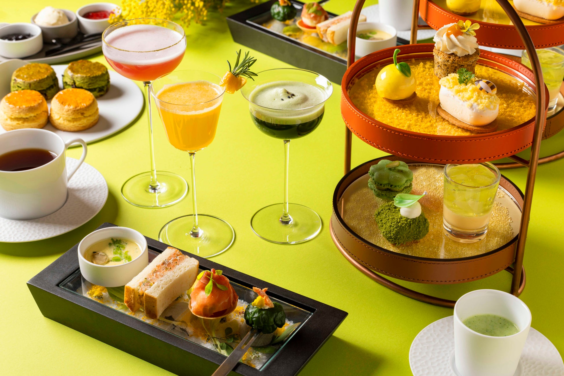 春を告げる花であるミモザは、「感謝」という花言葉を持ち、愛や幸福を象徴する花として3月8日に女性へ贈られるシンボリックな存在です。幸福感とエネルギー溢れるミモザイエローと、瑞々しい新緑のグリーンをテーマカラーにメニューを構成いたしました。ベイクドチーズとレアチーズを2層にしたダブルチーズケーキの上には、細かく砕いたスポンジ生地の上に留まっているミツバチが可愛らしく、春のワンシーンを彩ります。菜の花や新玉ねぎなど、春の訪れを告げる野菜を使用したセイボリーは、一品一品を繊細に仕上げ、浅利と菜の花のロワイヤルや、手まり寿司をイメージした桜海老と帆立のタルタルなど、春の味覚が味わえます。それぞれ3月、4月、5月をイメージしてバーテンダーが考案したこの春限定のスペシャリティモクテルは、3種類からお好きなものを1杯お選びいただけます。3月をイメージし、カクテル“ミモザ”をノンアルコールにアレンジしたモクテルは、旬のデコポンを使用し、鮮やかで美しいミモザイエローの見た目とフルーティーで香り高い味わいに仕上げています。