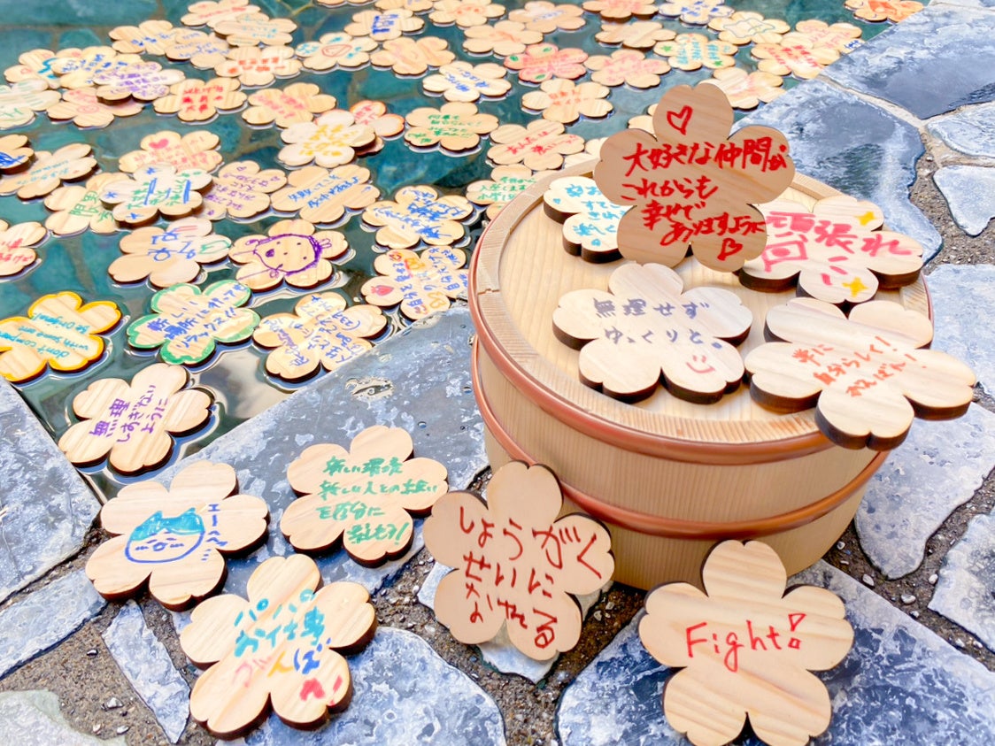 4月から新たなスタートをきる方々に向けて、エールを送るおふろを開催。桜型のヒノキ⼊浴⽊にお客さまからの応援メッセージを記入していただき、男女露天風呂に浮かべます。湯船の中でメッセージを読みながら、⾝も⼼も温まったあとで100個目の「頑張れ」を完成させるのはお客さま。残りひとつのメッセージは、お客さまから⼤切な⽅へ直接エールを届けてください。