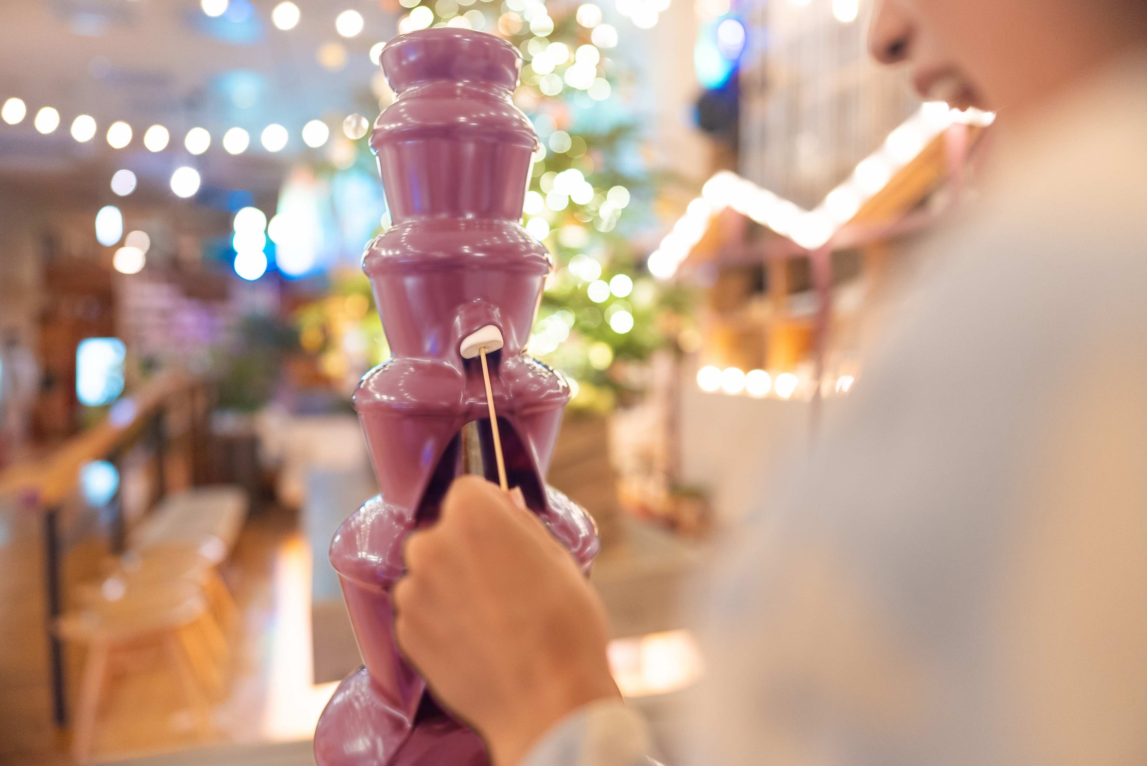 桜色の流れるチョコレートにマシュマロやプチシュークリームなどをつけて楽しめるチョコファウンテンイベントを開催。桜の木の下で桜色のチョコレートをたっぷりとお楽しみください。