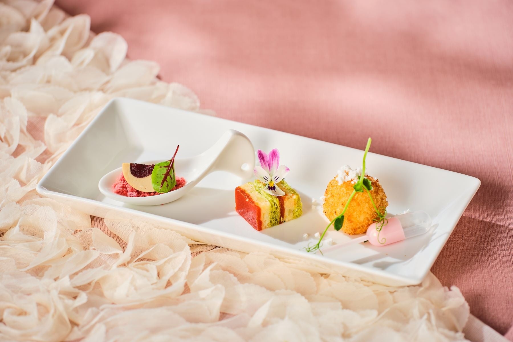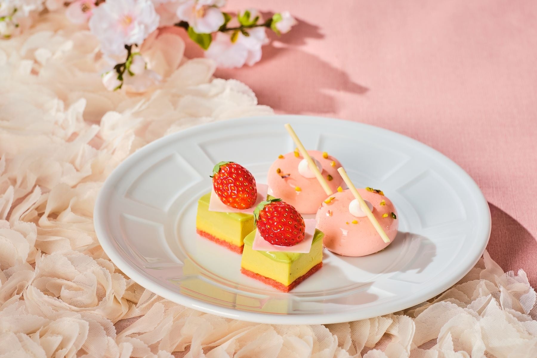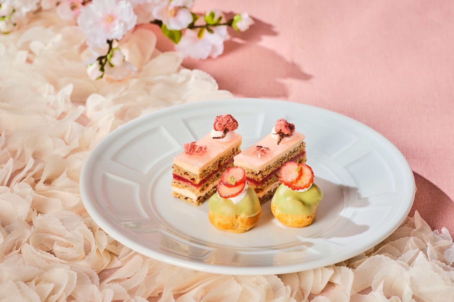 桜クリームとフレッシュいちごで仕上げた見た目も華やかな「桜といちごのヴェリーヌ」、淡いグラデーションが美しい「イタリア産ピスタチオとベルガモットのムース」、桜の風味とヘーゼルナッツの食感を楽しめる「SAKURAオペラ」、甘い香りのスパイスが効いたムースなど、お花見気分を味わえるスイーツ6種類と、ズワイ蟹とスピナッチブレッドのサンドイッチやとフォアグラとアマレーナチェリーのムース、ジャーマンポテトのクロケット&さくらクリームなど特製セイボリー3種類をご堪能いただけます。