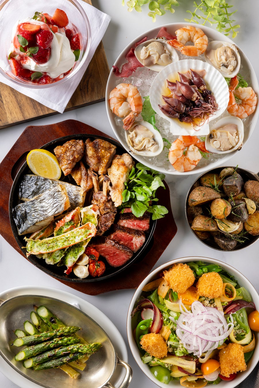 スプリング ラムや鰆、はまぐり、ホタルイカなどをダイナミックに調理した春のサーフ&ターフを提供
