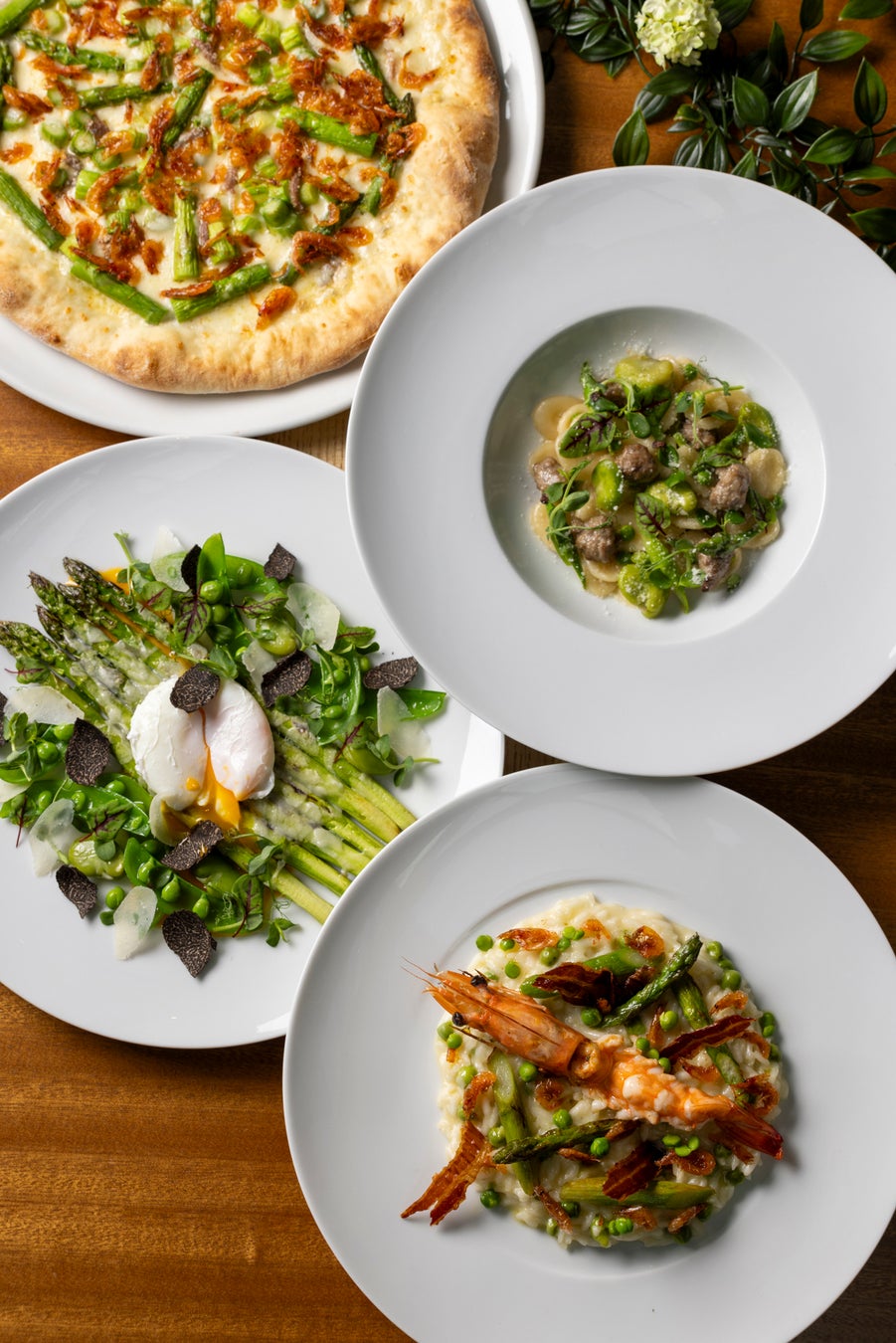 オーセンティックかつ旬の素材を生かしたモダンなイタリアン カフェ「フィオレンティーナ」では、「イタリアの新緑」をテーマに、グリーンアスパラガスやグリンピース、スナップエンドウやそら豆など、青々とした旬の野菜をふんだんに取り入れたメニューをアラカルトでご用意します。イタリアのイースターに欠かせない仔羊をサルシッチャ(ソーセージ)にし、グリーン野菜とあわせたパスタや、 “春の祝いのリゾット”としてイタリアで愛される、新鮮なグリンピースのやさしい甘みが広がる「リージ エ ビージ」など、イタリアの春を感じるメニューの数々を心ゆくまでご堪能ください。