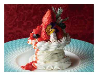 ■ 『いちごのパヴロヴァ』 構成要素 メレンゲ / 生クリーム / いちごマスカルポーネアイス / 生クリーム / メレンゲ / いちごパウダー / ブリュレクリーム / いちご / いちごクリーム / ブルーベリー / フラワー・ローズマリー 別添え:いちごソース |