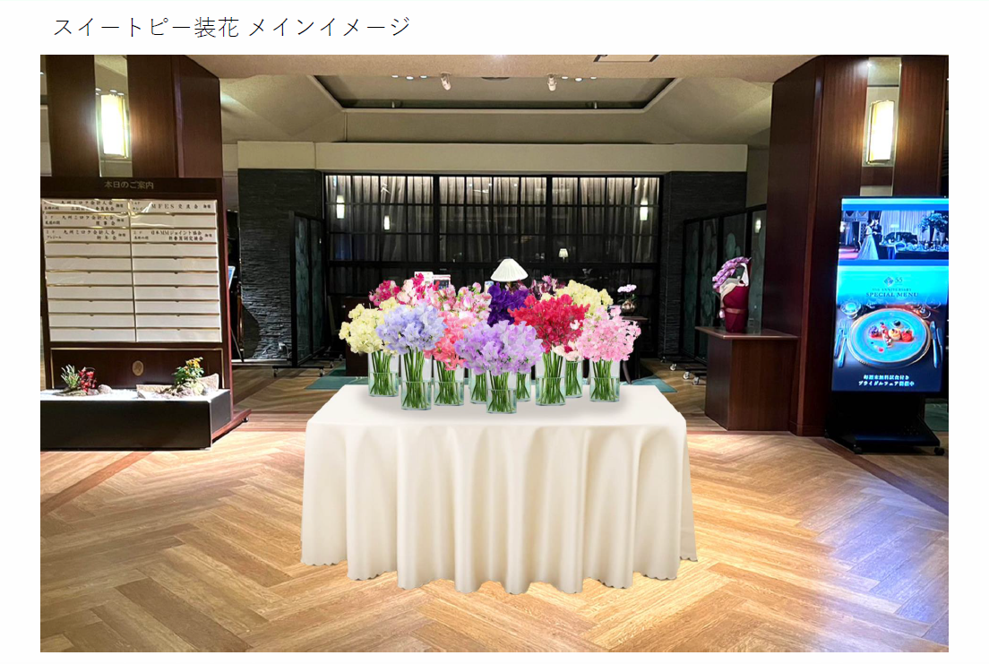 また、フェアが開始される3月1日から一週間程度、西鉄グランドホテル内ロビーで生産量日本一の宮崎県産スイートピーを展示します。約2,000本のスイートピーが、フェアに花を添えてくれます。