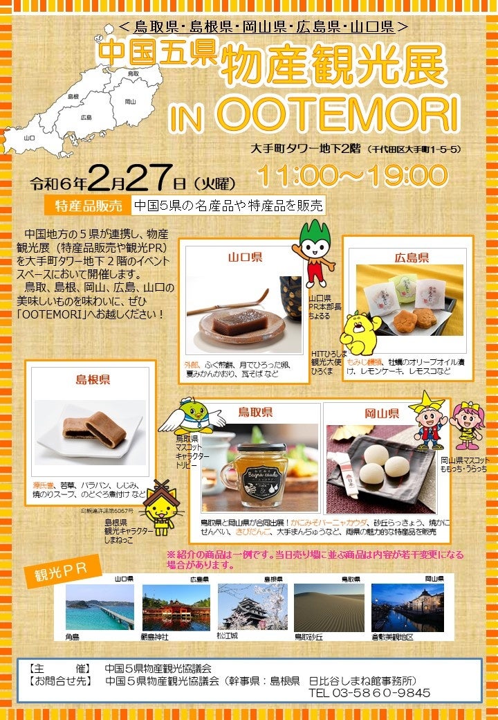 中国5県の東京事務所で組織する「中国五県物産観光協議会」では、このたび、首都圏での物産及び観光の振興を図ることを目的として、物産観光展を開催いたします。