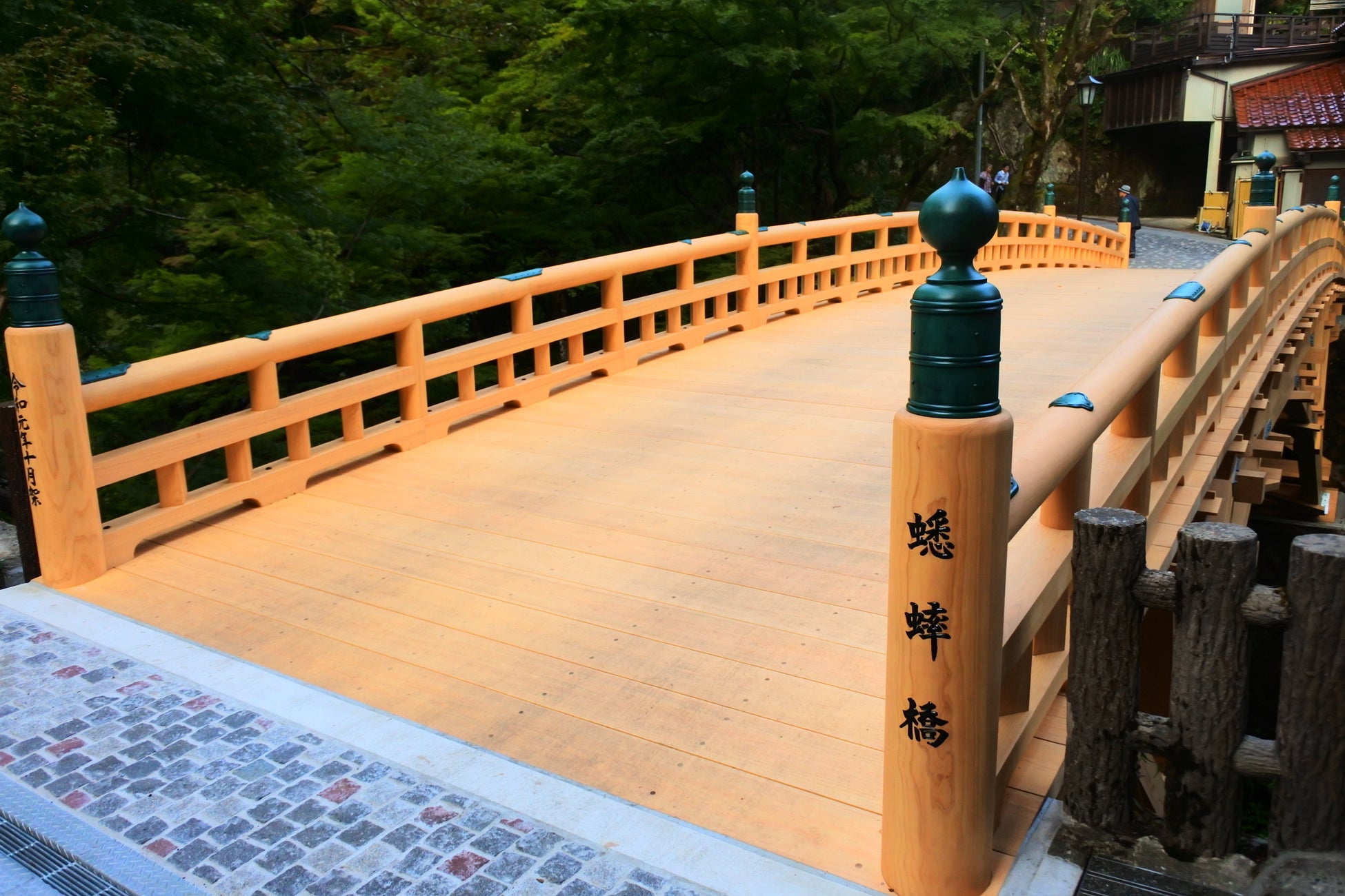 温泉街に沿って流れる大聖寺川の渓谷「鶴仙渓」1.3kmの遊歩道には、風光明媚な自然が残り、「こおろぎ橋」から「川床」、「あやとりはし」ライトアップなどへぜひ散策を。