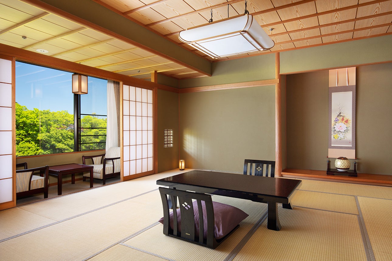 大聖寺川を眼下に渓流のせせらぎをBGMに、ゆったりと寛げるお部屋は、露天風呂付き客室・和室・洋室10タイプから、旅のスタイルに合わせてお選びいただけます。
