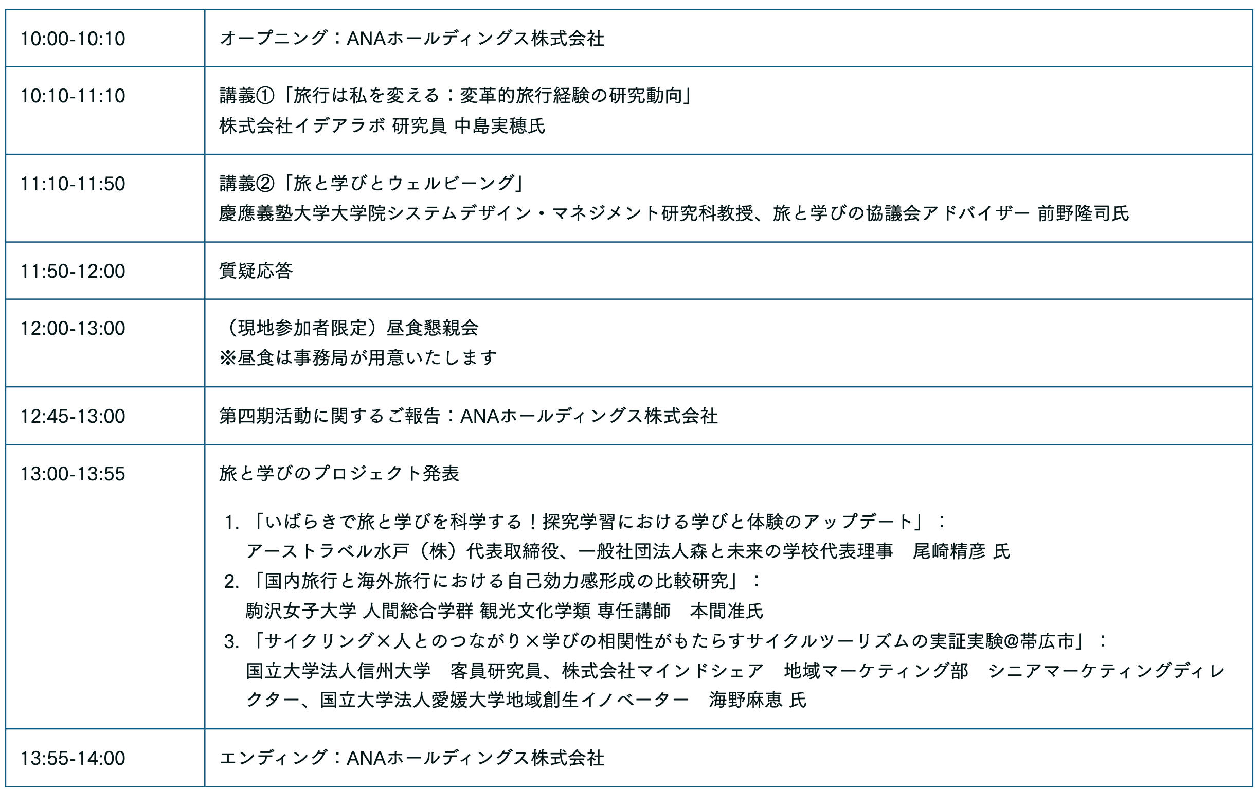 「旅と学びの協議会」は、ANAホールディングス株式会社が、立命館アジア太平洋大学(APU)学長 出口治明氏、理事 東京学芸大学大学院准教授、スタディサプリ教育AI研究所所長 小宮山利恵子氏、慶應義塾大学大学院システムデザイン・マネジメント研究科教授 前野隆司氏、駒沢女子大学観光文化学類教授 鮫島卓氏をコアメンバーとした有識者とともに、教育工学・幸福学・観光学の視点から、旅の効用を科学的に検証し、次世代教育の一環として旅の活用を提言することを目的に2020年6月に設立した任意団体です。