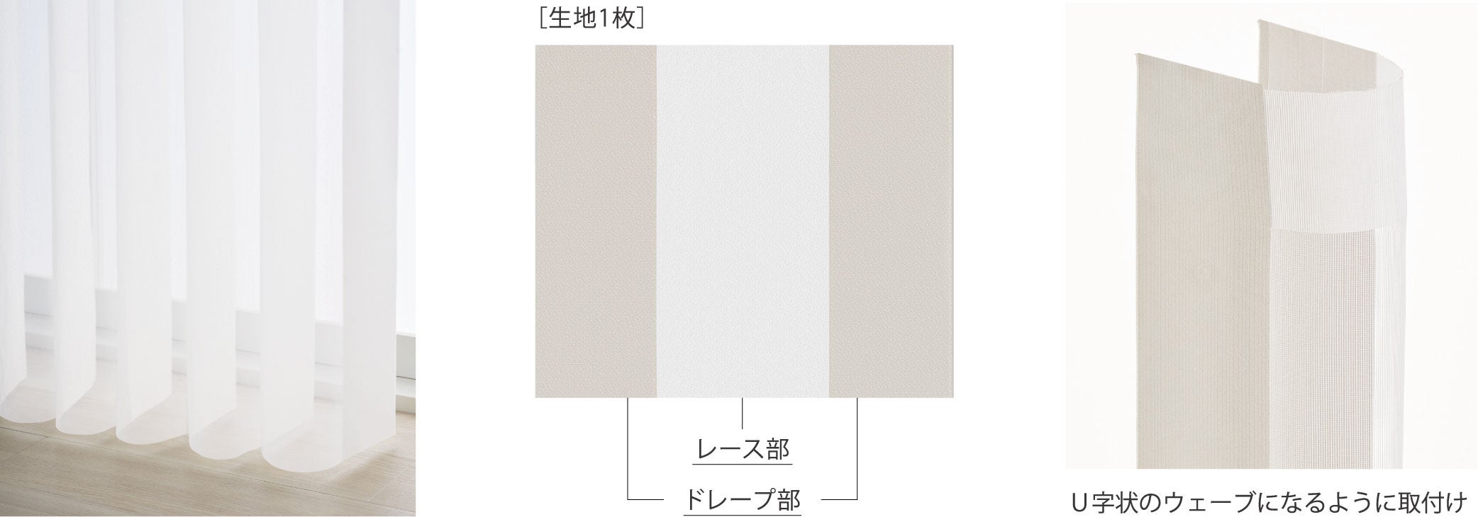 ドレープ:シンプルで緻密な組織とマットな風合い/レース:ドレープに合わせたシンプルな意匠性