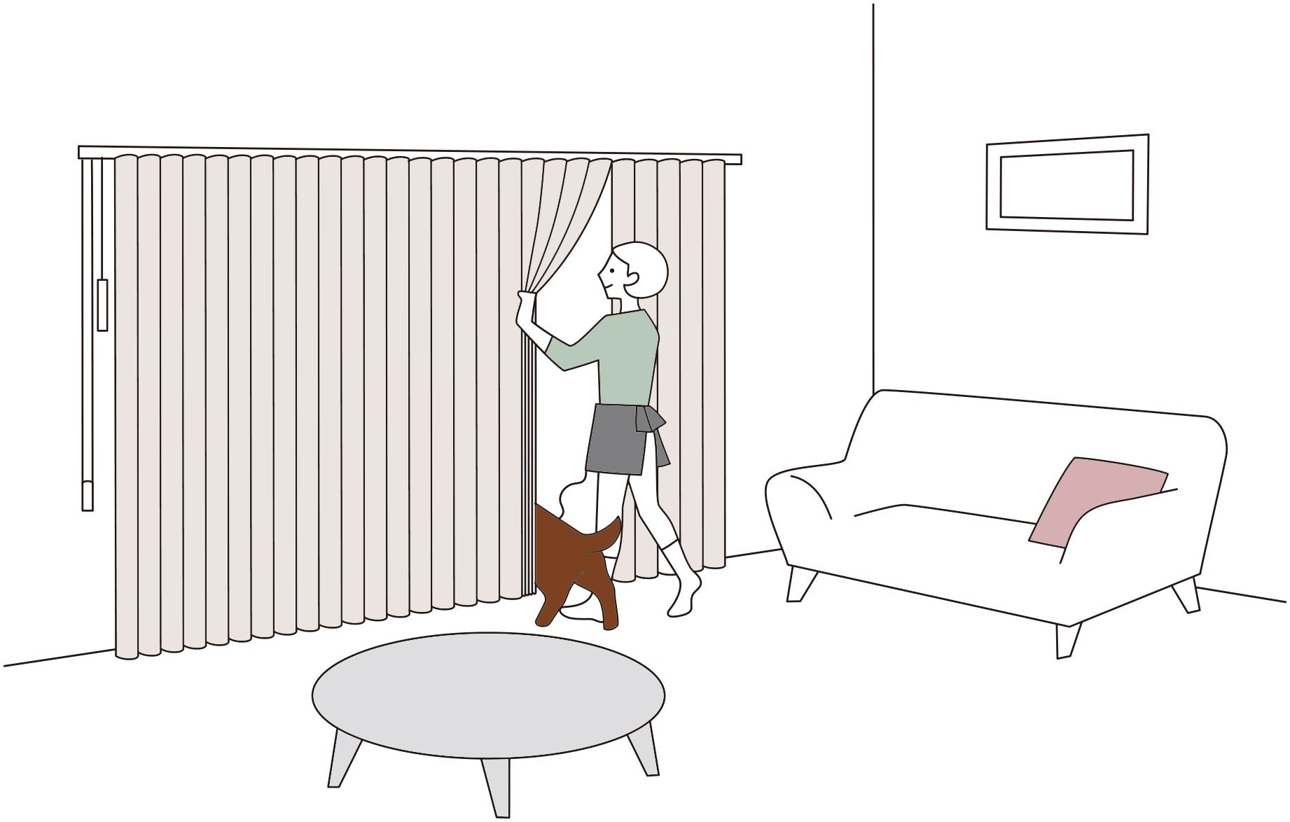 「エアレ」はひとつひとつの生地が分かれているタテ型ブラインドのため、採光時でも、全閉時でもブラインドを開けることなく、まるでカーテンをすり抜けるようにどこからでも自由に出入りすることが可能なため、洗濯物の取り込みなど、室内との行き来が頻繁に発生する場合でも手間がかかりません。また、外からの遮蔽性を維持したまま出入りすることができるため、視線対策にもおすすめです。