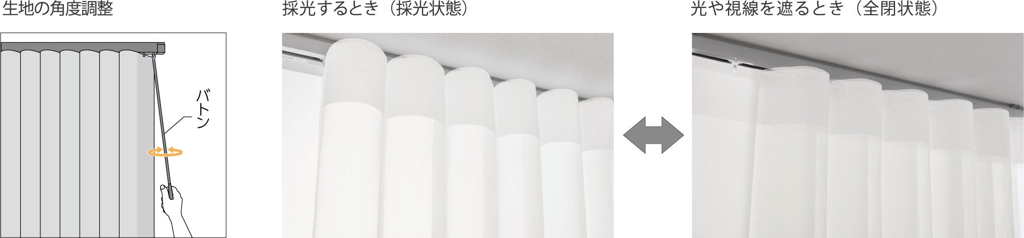 製品はバトンやドライブコードで左右に開閉。バトンをまわすだけで、採光から全閉までスマートに調節できます。