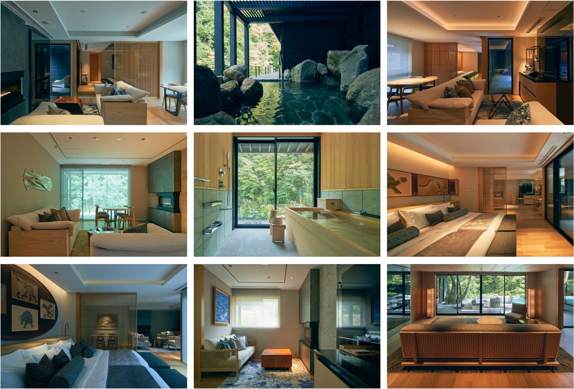 9つの個人邸宅型施設(客室)は、プライベートプールと温泉を備え、各棟の設えや装飾を選りすぐりのアーティストが1棟ずつ担当。