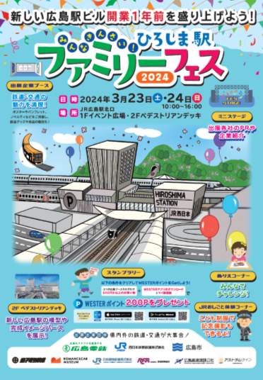 開業を1年後に控え、広島駅ビル開業を多くのお客様に知っていただくこと、また、鉄道の魅力を改めて知っていただくことなどを目的に、この度、各鉄道会社などと共同で3月23日(土)、24日(日)の2日間、広島駅北口イベント広場を中心として、「新しい広島駅ビル開業1年前を盛り上げよう!みんなきんさい!ひろしま駅ファミリーフェス2024」を初めて開催することとなりましたので、お知らせします。