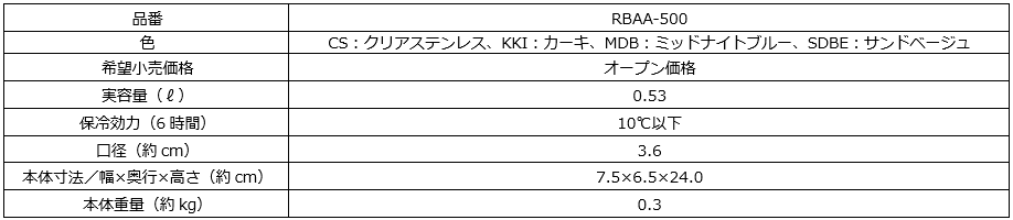 『サーモス 保冷炭酸飲料ボトル(RBAA-500)』 仕様一覧