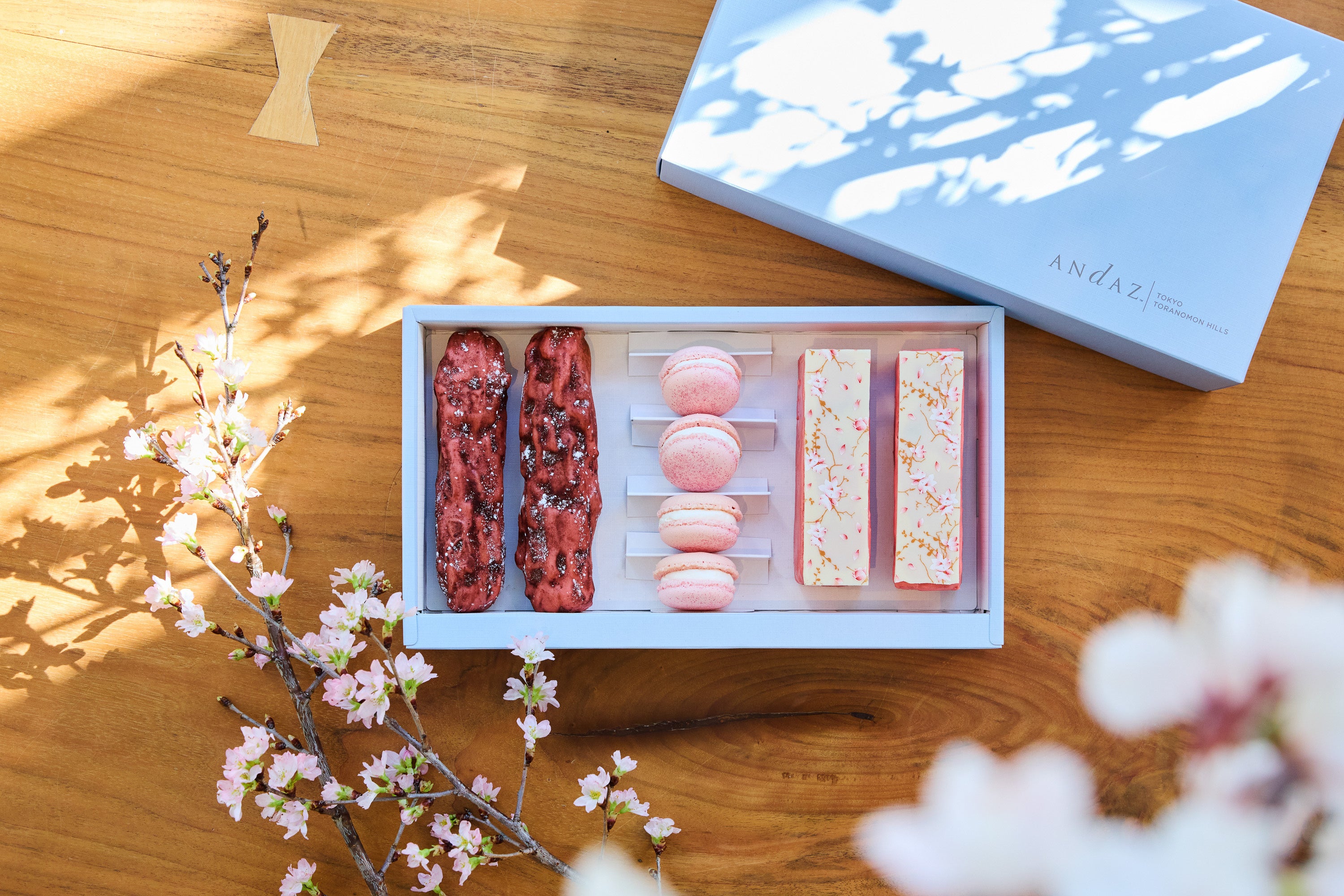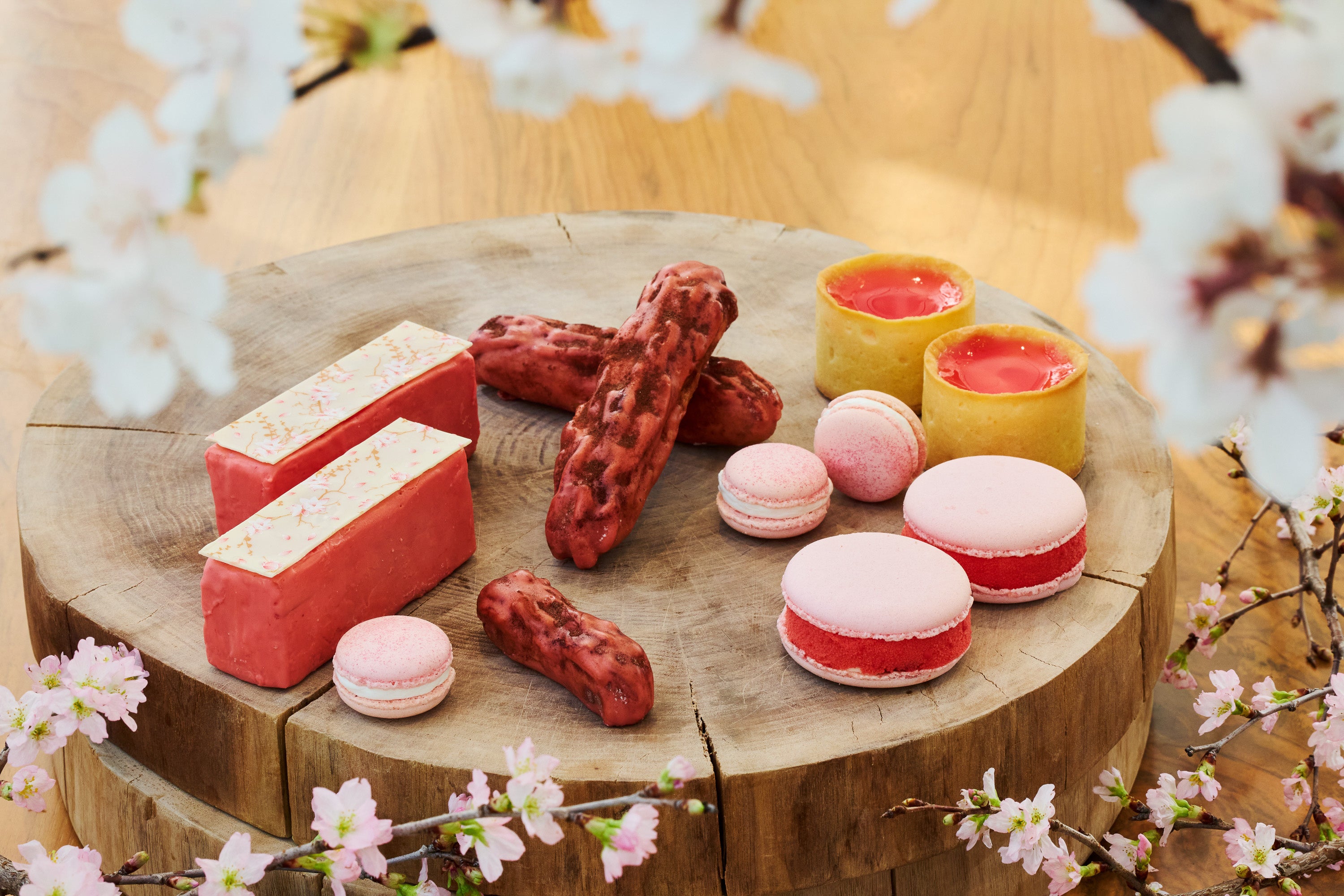 ペストリー ショップでは、ペストリーシェフ、ノルマン・ジュビンが手がける日本特有のお花見文化へのオマージュを込めた心躍る桜スイーツと、オリジナルの桜ドリンクをご用意いたします。「桜スイーツボックス」は、ミニサイズのマカロンやエクレアなどを詰めた淡いピンク色が目を引くお花見にぴったりの限定ボックスです。「赤紫蘇エクレア」は、たっぷりの紫蘇クリームと紫蘇のジュレを絞った、和製ハーブとも言われる紫蘇特有の爽やかな香りをお楽しみいただけるユニークなスイーツ。桜の幹をイメージしたエクレアは、粉糖を振りバーナーで炙って仕上げることにより、表面に桜が舞っているかのような芸術的な美しさを放っています。