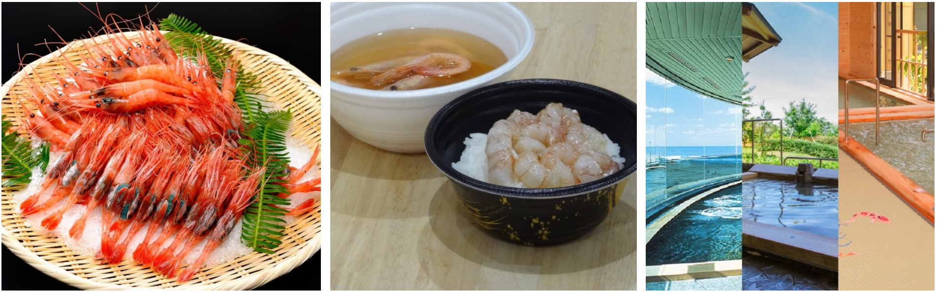 「港で朝食・湯めぐり」プランは、北陸新幹線福井開業日である2024年3月16日(土)に、民宿いたもと、みくに隠居処、三国オーシャンリゾート&ホテルなど8つの対象宿泊施設をご予約される方に向けて、東尋坊三国温泉3ヶ所を無料で巡ることができる湯めぐりチケットと、三国港朝市周年祭での無料朝食チケットを配布するプランです。本プランをご利用される方は、日本海や九頭⻯川が一望できる展望風呂のある日帰り温泉に無料で入浴できるほか、今年で2周年を迎える三国港朝市周年祭の三国港食堂にて、鮮度の落ちが早く県外にほとんど流通しない幻の「ガサエビ」を使った贅沢な丼と三国港特産の甘エビを使った香り豊かな「味噌汁」を、朝食として無料で提供します。北陸新幹線延伸を機に、坂井市が誇る温泉と海の幸をご堪能ください。