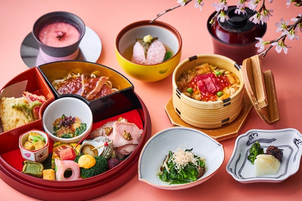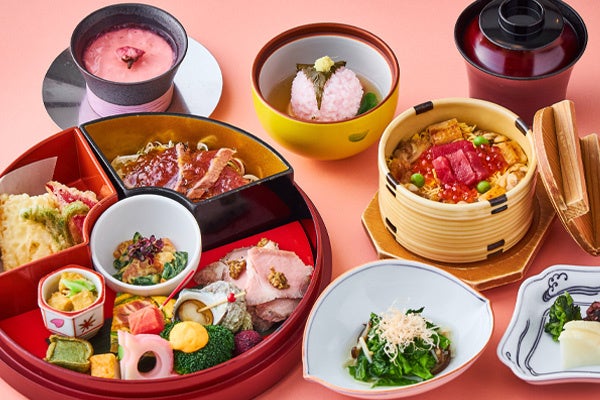 色鮮やかな御膳は旬の食材をふんだんに使用し、見た目・味、それぞれから春を感じていただけるように仕上げました。八寸には旬の姫さざえをカツオ出汁とお酒、しょうゆで煮て柔らかく炊き上げた旨煮をご用意しました。また、菜花のほろ苦さときのこの旨味を辛子で風味良くまとめたお浸しもおすすめです。酢の物は、旬の赤貝と分葱を辛子酢味噌で和えた食感を楽しめる一品です。煮物は桜色にした道明寺粉で鯛を包み、桜の葉とともに蒸しあげた“鯛桜蒸し”をご賞味ください。牛乳プリンに桜のリキュールジュレをあわせ、塩漬けした桜を添えた“桜のプリン”で締めくくり、最後まで春を感じていただける御膳となっています。