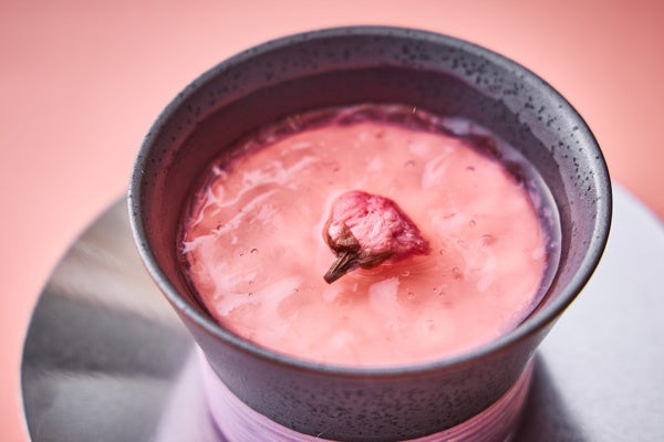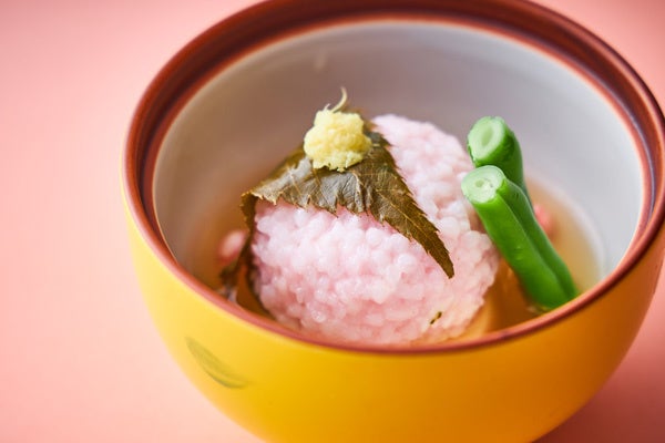 色鮮やかな御膳は旬の食材をふんだんに使用し、見た目・味、それぞれから春を感じていただけるように仕上げました。八寸には旬の姫さざえをカツオ出汁とお酒、しょうゆで煮て柔らかく炊き上げた旨煮をご用意しました。また、菜花のほろ苦さときのこの旨味を辛子で風味良くまとめたお浸しもおすすめです。酢の物は、旬の赤貝と分葱を辛子酢味噌で和えた食感を楽しめる一品です。煮物は桜色にした道明寺粉で鯛を包み、桜の葉とともに蒸しあげた“鯛桜蒸し”をご賞味ください。牛乳プリンに桜のリキュールジュレをあわせ、塩漬けした桜を添えた“桜のプリン”で締めくくり、最後まで春を感じていただける御膳となっています。