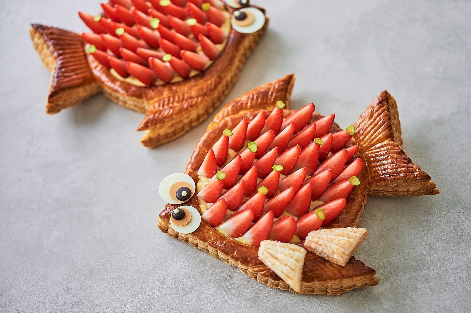 魚を象った「ポワソン・ダブリル」は、エイプリルフールに楽しむフランスの伝統菓子。土台となるパイ生地には国産バターやフランス産小麦を使用し、リッチな味わいながら軽やかな食感に焼きあげました。ピスタチオとアーモンドクリーム、フランボワーズのコンフィチュール、カスタードクリームを重ね、鱗に見立てた苺を贅沢にあしらった心躍るスイーツです。