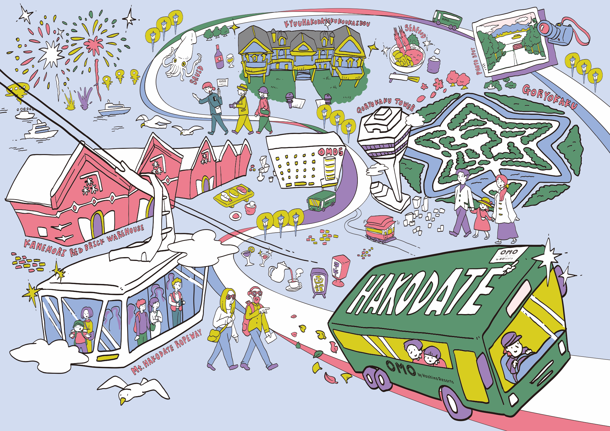 市内の観光地を周遊する「函館ぐるぐるフリーバス」は、OMO5函館に宿泊するお客様限定の無料周遊バスです。バスはOMO5函館を起点とし、約1時間ごとに周遊します。はこだて自由市場からベイエリア、元町公園、函館山ロープウェイ、そして五稜郭をつなぐルートで、乗車時間を組み合わせることですべてのスポットを巡ることができます。